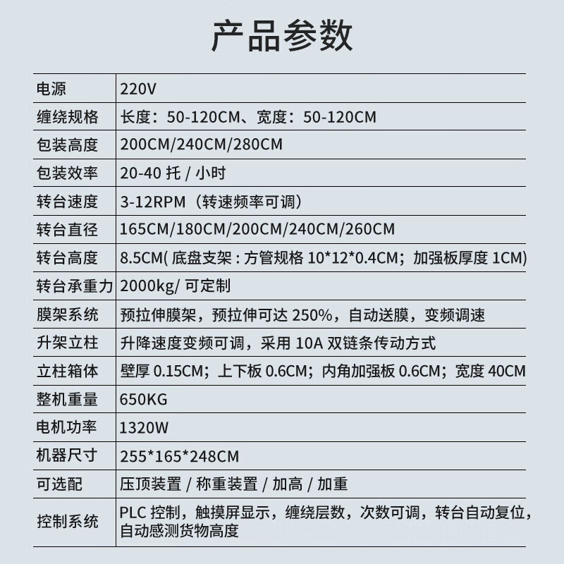 智能全自動纏繞機,2噸超大承重,加厚大托盤堅固更耐用,強勁動力高效銅芯電機,數控顯示屏方便調節操作簡單。