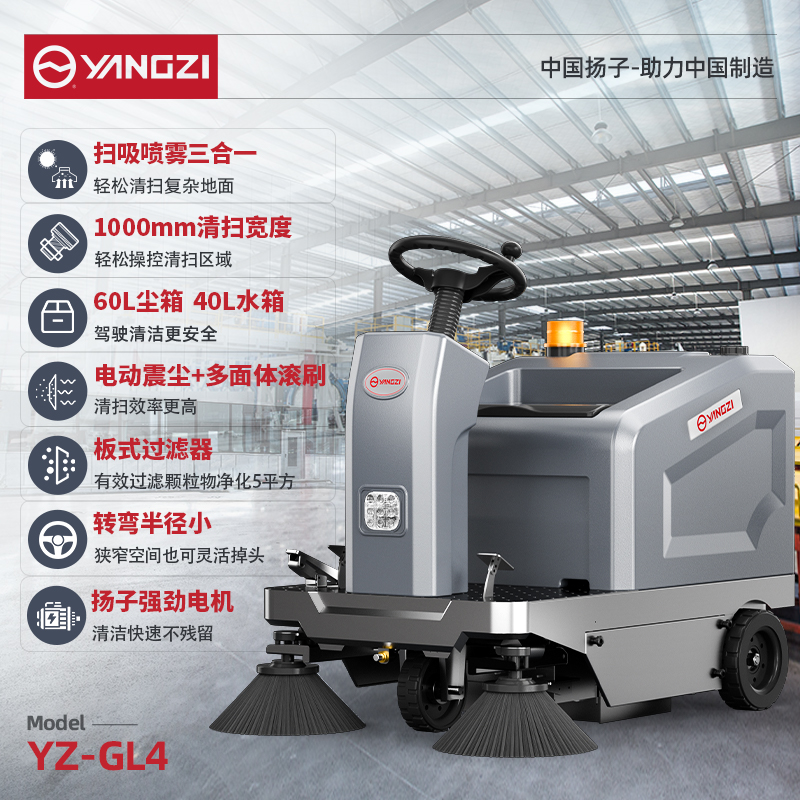 揚子掃地機YZ-GL4,60L集塵箱,1000mm清掃寬度,40L清水箱,高效清掃省心又省錢。